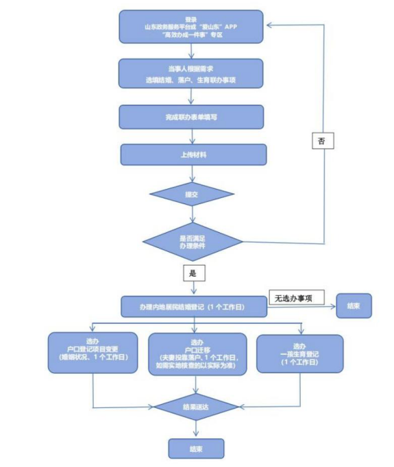 1.登录山东政务服务网—“高效办成一件事”平台—“结婚落户一件事”模块;
